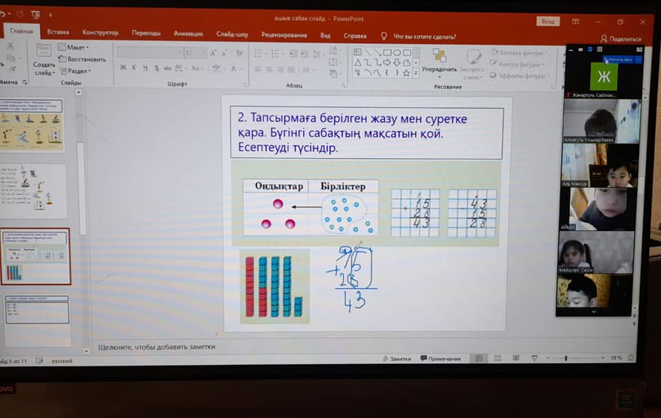 02.12.2020 ж. 2 «Ә» сынып жетекшісі Кошкарбаева А.К. математика пәнінен «Екі таңбалы сандарды қосу және азайту алгоритмі. 15+28, 43-15» тақырыбында ашық сабақ