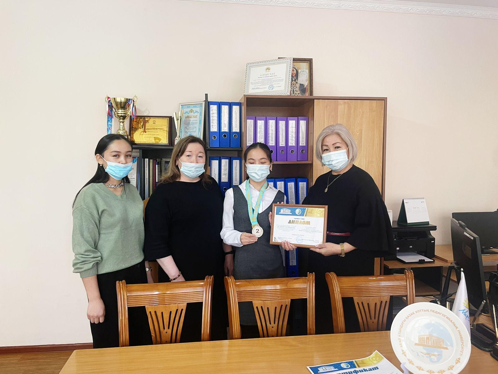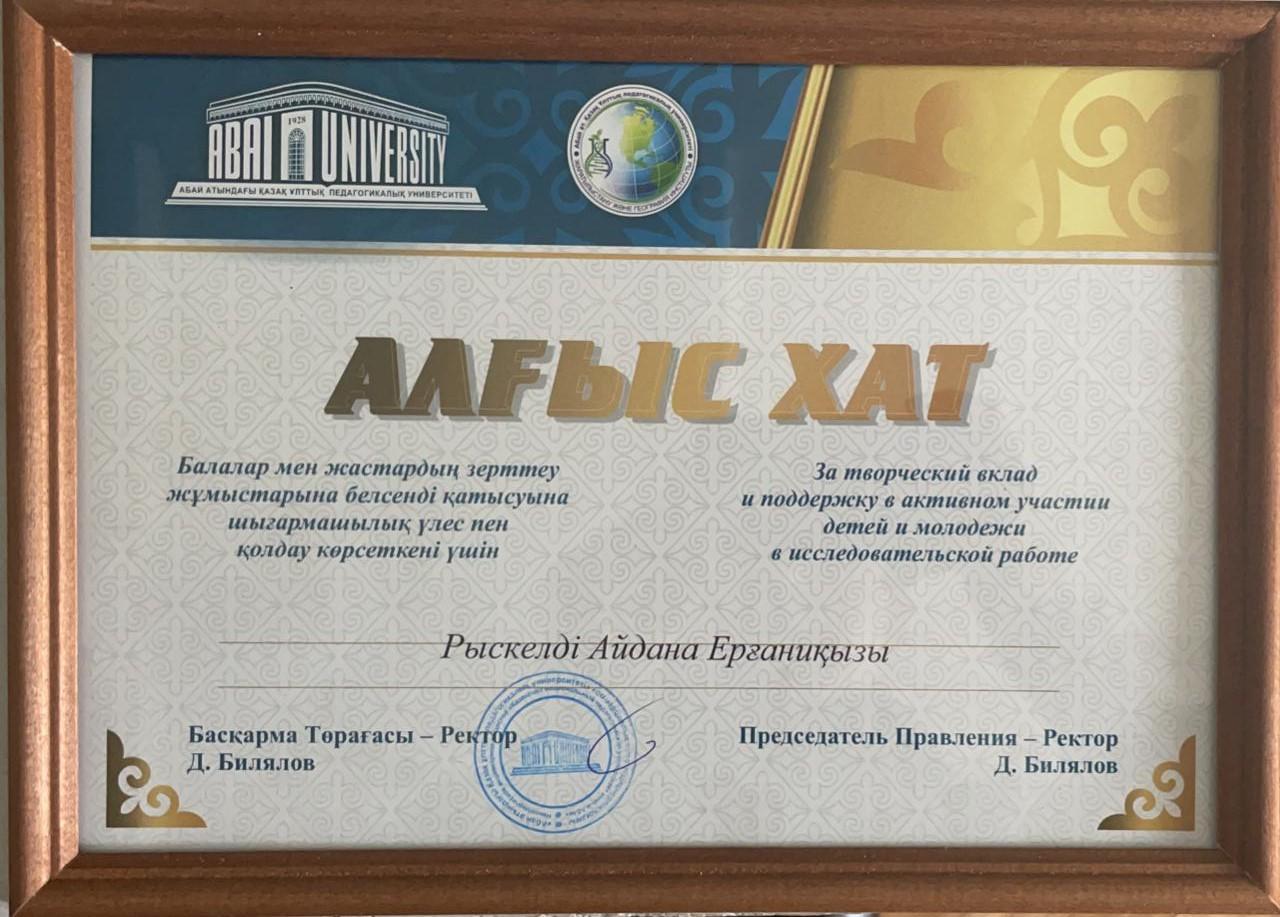 №122 жалпы білім беретін мектептің биология пәні мұғалімі Рыскелді Айдана Ерғаниқызы балалар мен жастардың зерттеу жұмыстарына белсенді қатысуына шығармашылық үлес пен қолдау көрсеткені үшін "Алғыс хатпен" марапатталды.