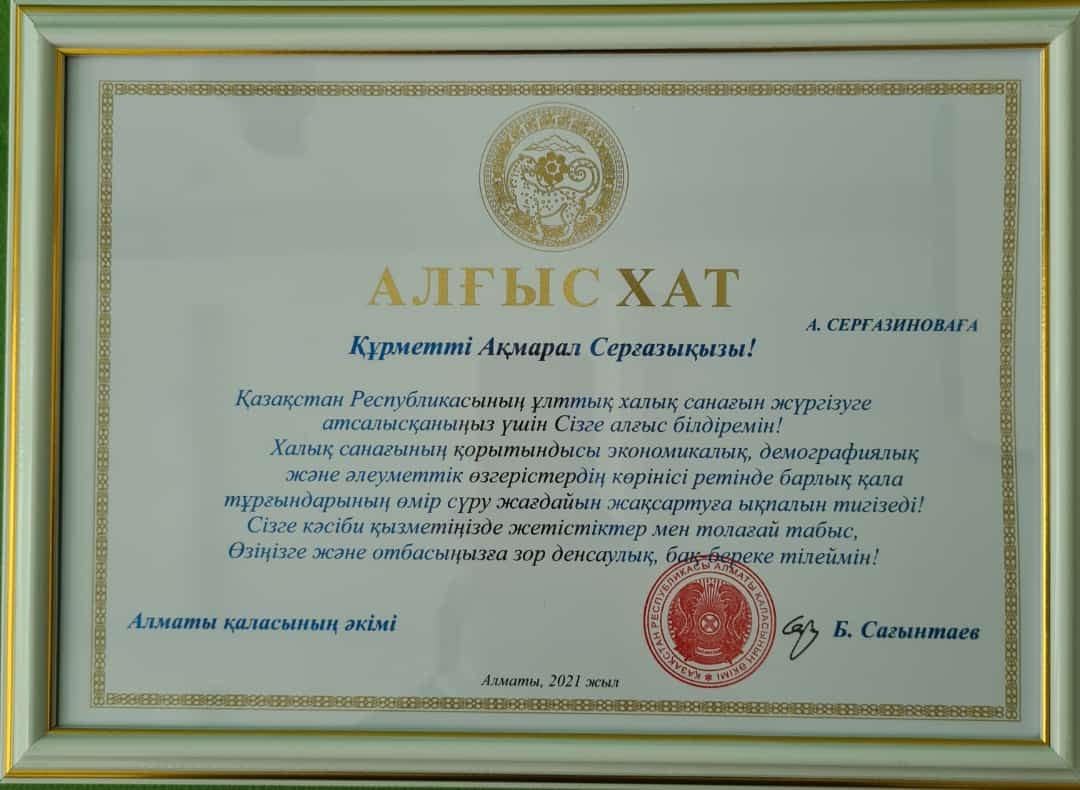 Қазақстан Республикасының ұлттық халық санағын жүргізуге атсалысқаны үшін, №122 жалпы білім беретін мектептің көркем еңбек пәнінің мұғалімі Сергазинова Ақмарал Сергазиновна, Алматы қаласының әкімі Б.Сағынтаевтың алғыс хатымен марапатталды. Құттықтаймыз!!!