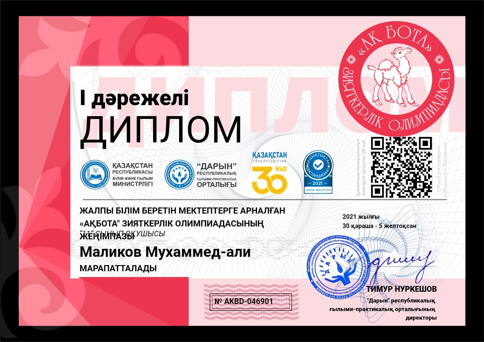 14 январь 2022 0 1 2 3 4 5 "Ақбота" Зияткерлік олимпиадасының жеңімпазы Маликов Мухаммед-али Осы беттің QR-коды:QR-код этой страницы: