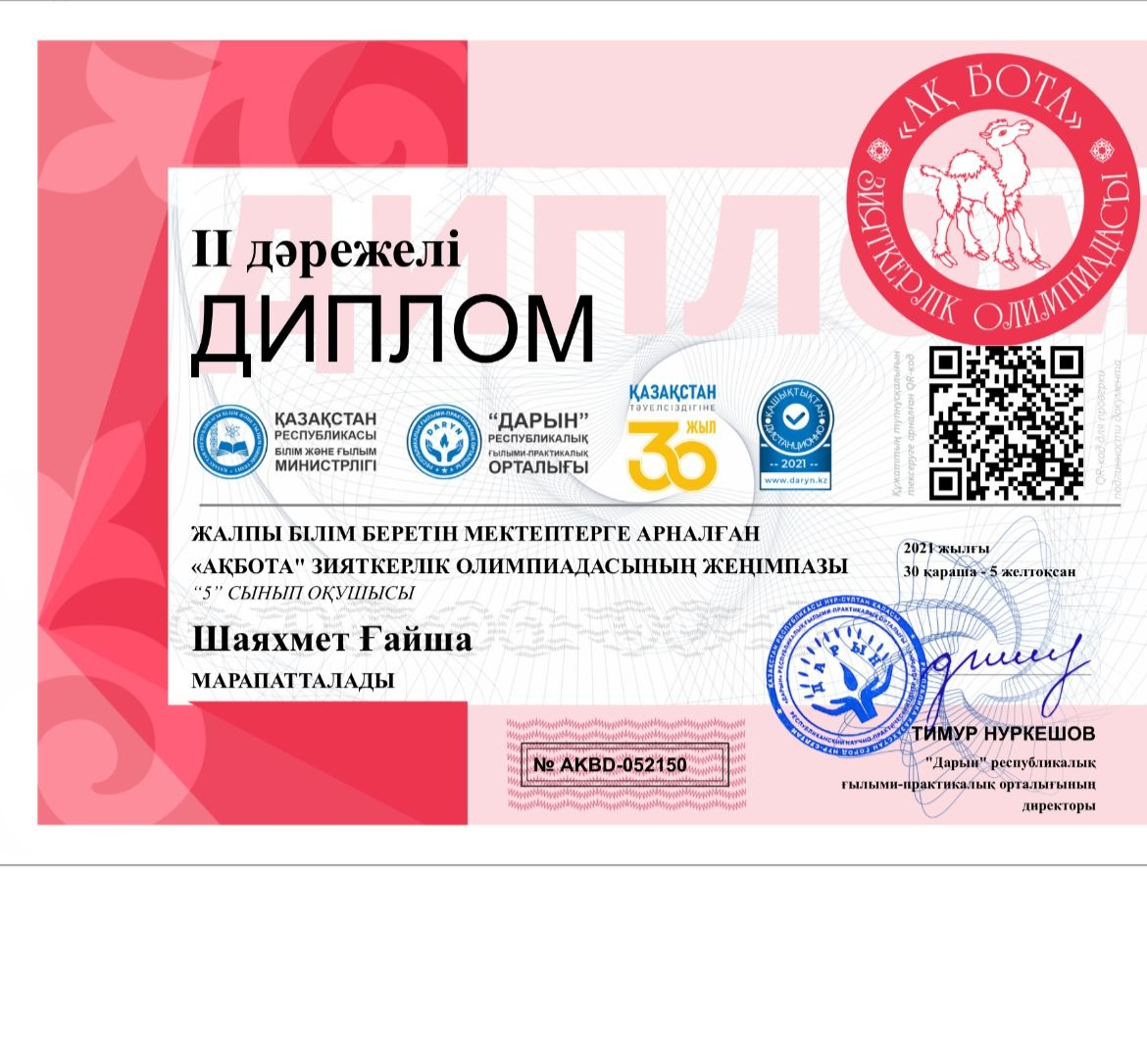 14 январь 2022 0 1 2 3 4 5 "Ақбота" Зияткерлік олимпиадасының жеңімпазы Шаяхмет Ғайша Осы беттің QR-коды:QR-код этой страницы: