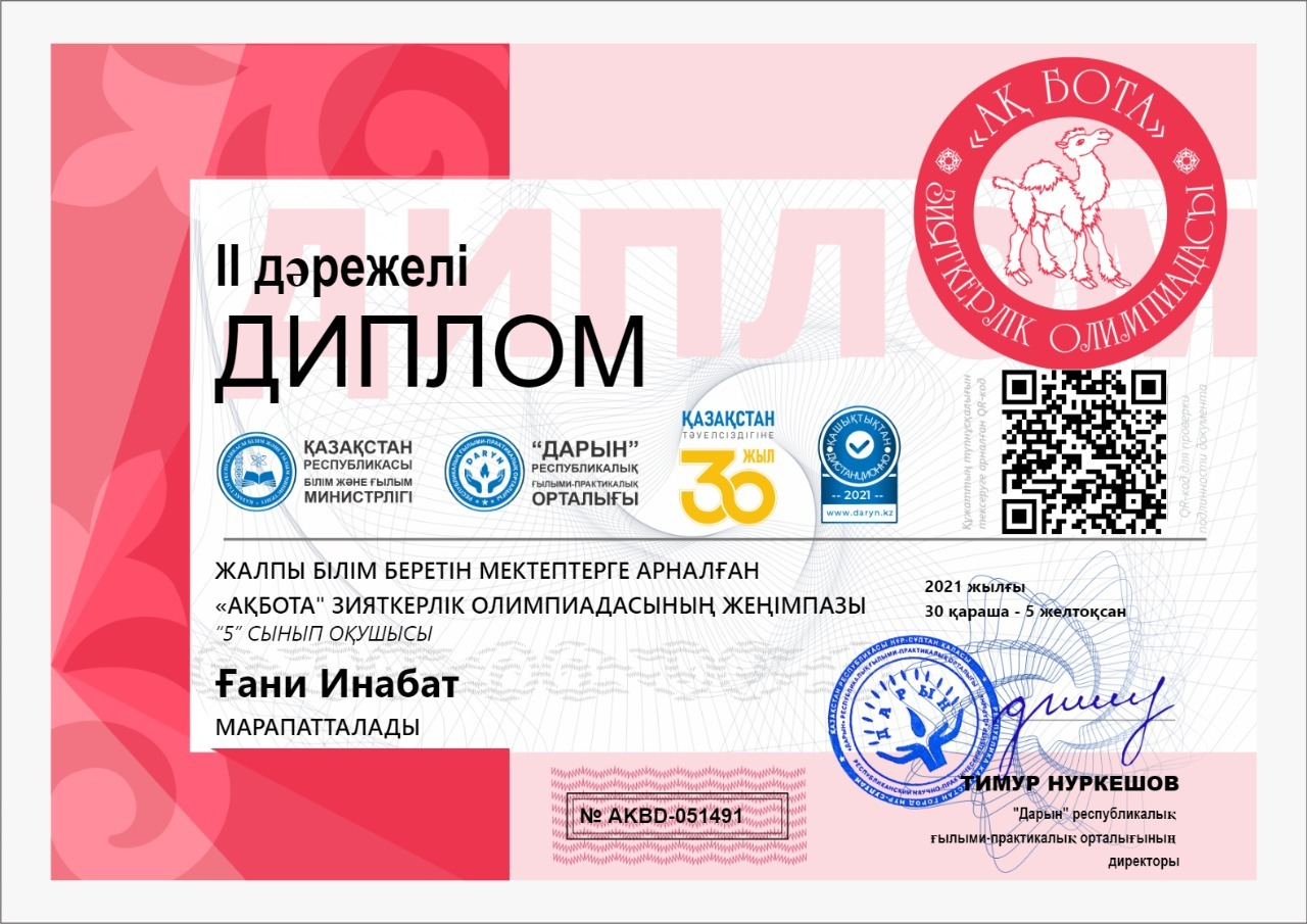 14 январь 2022 0 1 2 3 4 5 "Ақбота" Зияткерлік олимпиадасының жеңімпазы Ғани Инабат Осы беттің QR-коды:QR-код этой страницы: