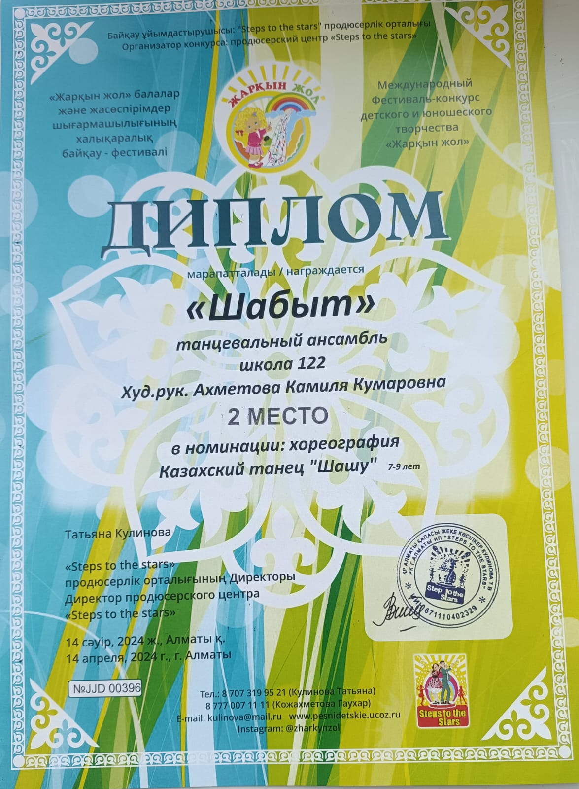 Алматы қаласы, Әуезов ауданы Халықаралық балаларды қорғау күні мерекесіне арналған "Алматы БАЛАFEST" балалар фестивалі аясында "Жұлдызды сәт" музыкалық шығармашылық және хореография байқауының “Хореография” номинациясы бойынша #122 жалпы білім беретін мектептің “Шабыт” би жас ансамблі жүлделі ІІI орынға иеленді.Жеңістеріңмен құттықтаймыз!!! Жетекшісі: К.К.Ахметова