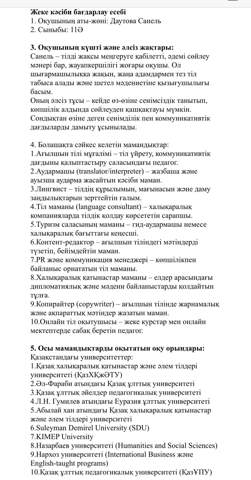Оқушылардан сауалнама алынды. Сауалнама нәтижесіне сүйене отырып, әр оқушыға жеке талдау жасалып, оның қай мамандыққа бейім екені анықталды. Сонымен қатар, таңдалған мамандық бойынша білім беретін 10 қазақстандық және 10 шетелдік жоғары оқу орны туралы ақпарат ұсынылды. Бұдан бөлек, алдағы уақытқа арналған жеке даму жоспары мен дамыту қажет қабілеттер бойынша ұсыныстар берілді.