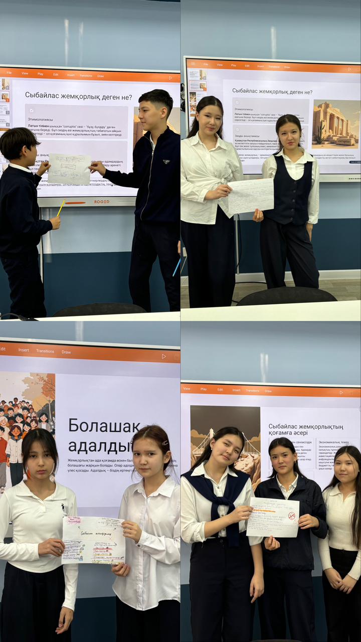 2026 жылдың 8 қаңтар күні 1–11 сынып оқушыларының қатысуымен «Біз сыбайлас жемқорлыққа қарсымыз!» акциясы аясында сынып сағаты өткізілді. Іс-шара барысында оқушыларға сыбайлас жемқорлықтың қоғамға тигізер кері әсері түсіндіріліп, адалдық пен әділдік құндылықтары насихатталды.