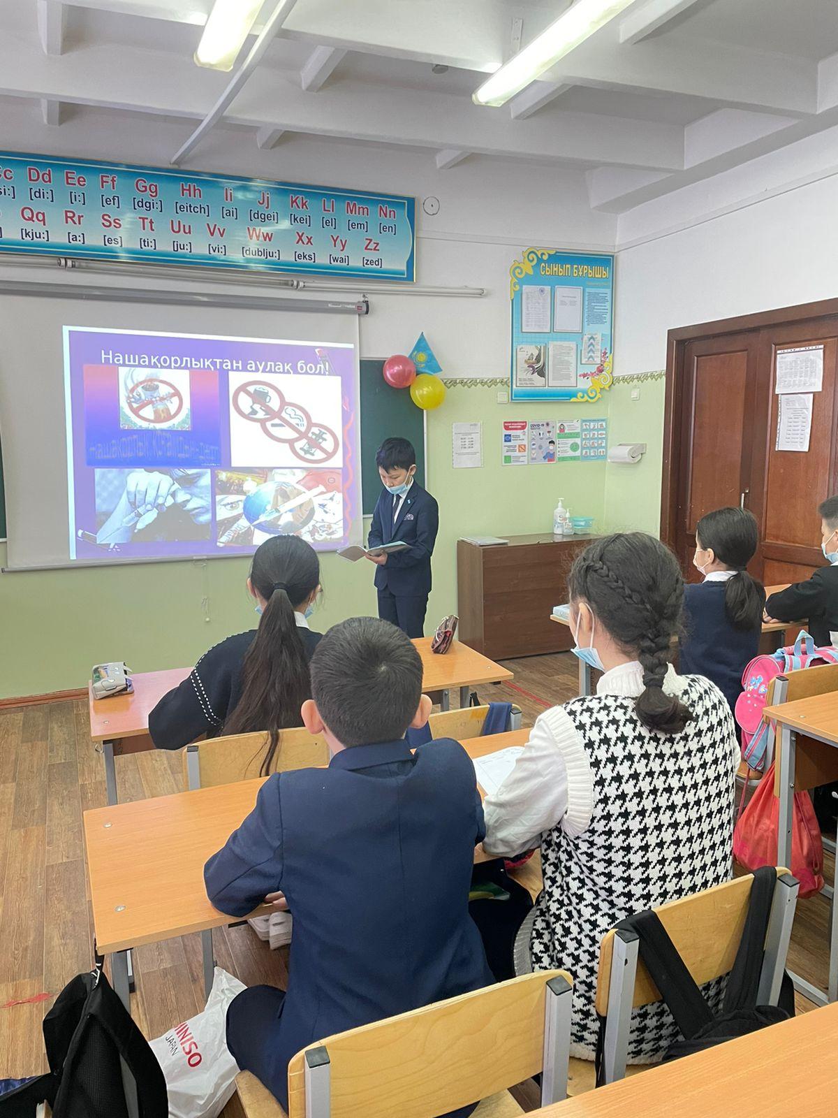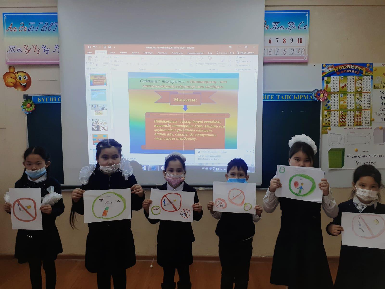 Мектептің оқу-тәрбие жоспарына сәйкес 15 ақпан 2022 жылы " Нашақорлық пен маскүнемдіктің себептері мен салдары" тақырыбында тәрбие сағаттары өтті.