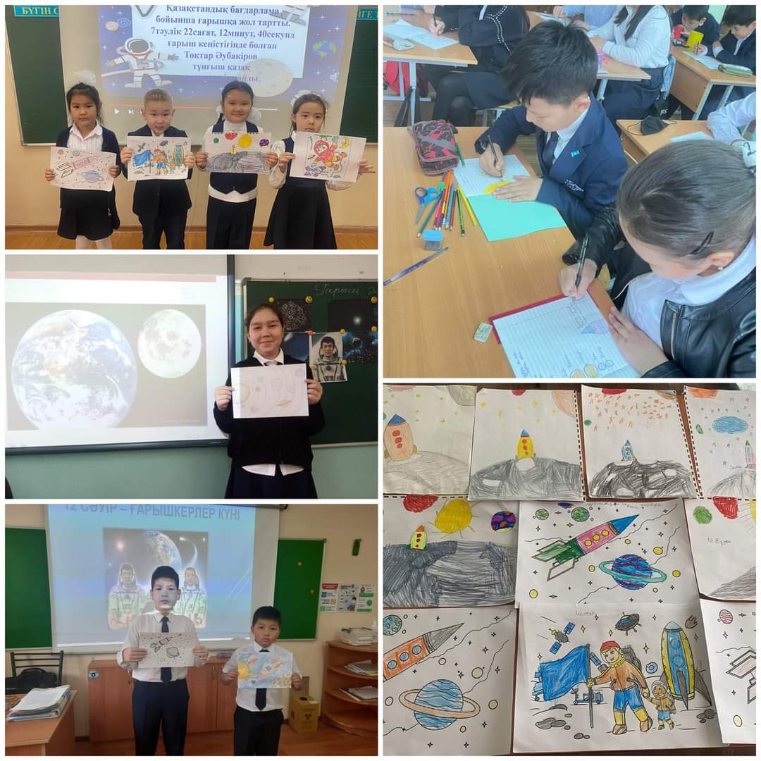 Бастауыш пен орта буын оқушылары ғарышты игерумен байланысты таныстырылымдар көріп, сурет салды.Жоғарғы сынып оқушылары қазақстандық ғалымдардың, өнертапқыштардың жетістіктері туралы бейнероликтер.көріп, ой бөлісті.Қазіргі таңдағы ғылым саласына қойылып жатқан талаптар, болашақтың мамандықтары сынды мәселелерді талқылады.