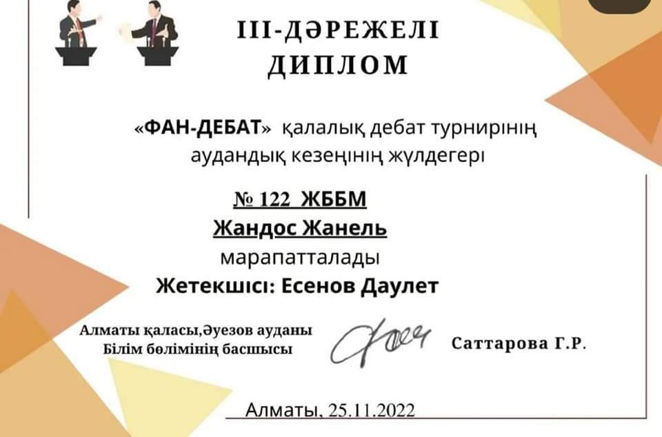 28 ноябрь 2022 0 1 2 3 4 5 "Фан-Дебат" қалалық дебат турнирі "Фан-Дебат" қалалық дебат турнирінің аудандық кезеңі болып өтті. Аудандық турнирде мектебіміздің 9 "А" сынып оқушылары Сатыбалды Дана мен Жандос Жанель 3-орынға ие болды, жетекшісі: тарих пәнінің мұғалімі Д.Б.Есенов. Осы беттің QR-коды:QR-код этой страницы: