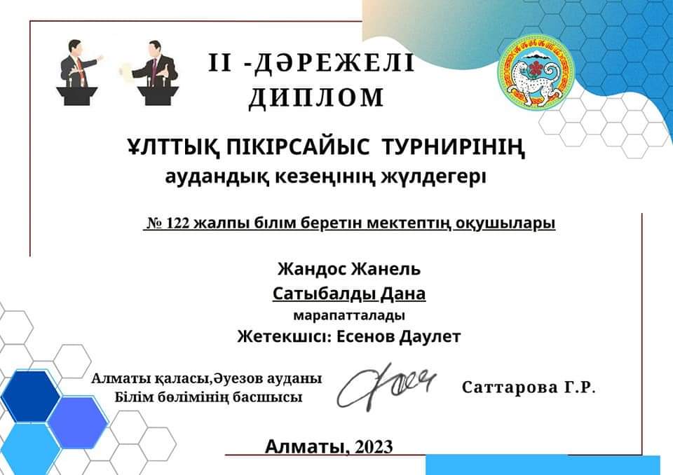 Алматы қаласы, Білім басқармасының «Алматы дарыны»дарынды балалар мен дарынды жастарды анықтау жане қолдау орталығы Алматы қаласы білім беру ұйымдарының 9-11 (12) сынып окушыларына арналған Окушылардың Ұлттық пікірсайыс турнирінің аудандық кезеңі болып өтті.Мектебіміздің атынан 9 сынып оқушылары Жандос Жанель мен Сатыбалды Дана қатысты. Оқушыларымыз II-орын иеленіп қалалық кезеңге жолдама алды.Жетекшісі: Есенов Даулет