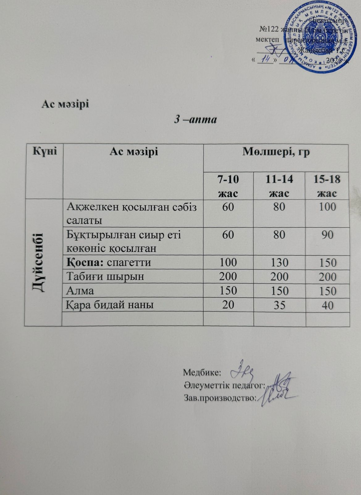 Сәуір айы 3 апта 1-күн ас мәзірі