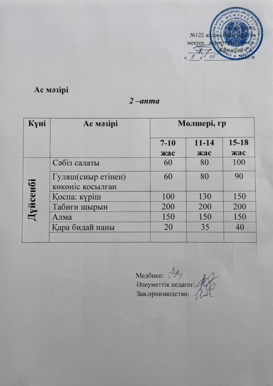 Мамыр айы 1-апта 2-күн ас мәзірі. 2022-2023 оқу жылы