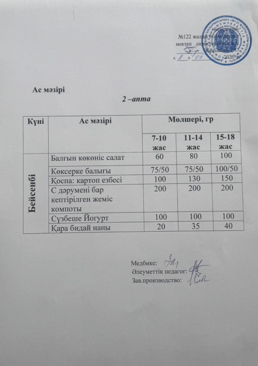 Мамыр айы 1-апта 2-күн ас мәзірі. 2022-2023 оқу жылы